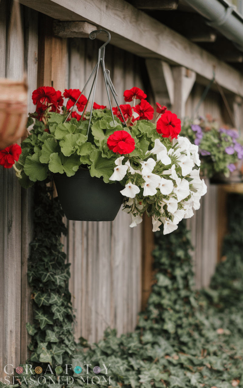 Hanging flower baskets are a classic cool garden idea because they bring height color and movement to your space since you can fill them with bright blooms like petunias geraniums or ivy and hang them on porches fences or trees and they instantly make your garden feel lush and full and it is also a great way to decorate areas that have no ground planting space while keeping the look soft and romantic.