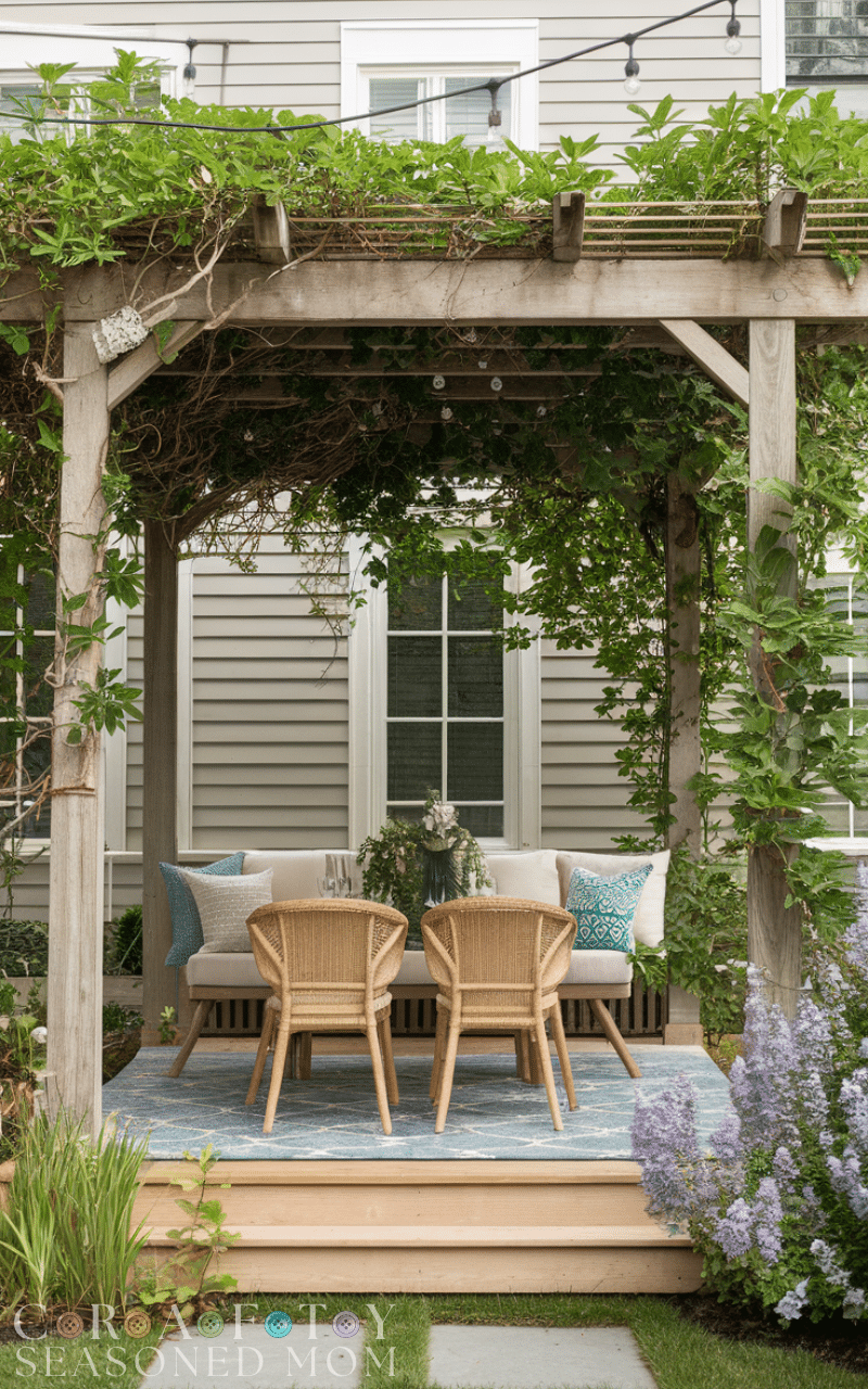 A pergola covered in climbing plants is a cool garden idea that adds shade beauty and romance to your space because you can grow ivy wisteria or jasmine that climb up the structure and create a natural canopy and it turns your seating area into a peaceful retreat with sweet scents and greenery all around and this idea works beautifully for relaxing afternoons or outdoor dining.