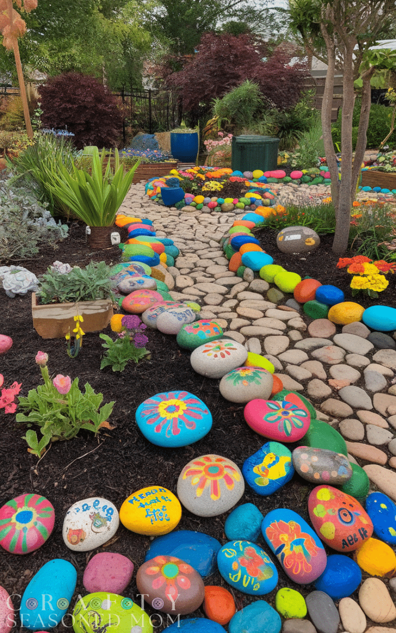 Colorful pebble art is a cool garden idea that adds fun and personality to your garden because you can paint smooth stones in bright patterns or words and place them along borders around pots or pathways and they bring cheer to any corner and this idea is perfect for families or kids who love to craft and it makes your garden truly one of a kind.