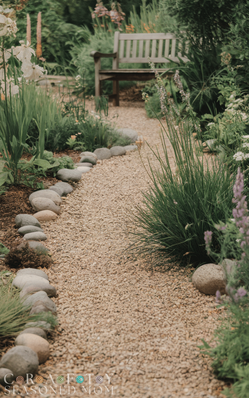 A gravel path is a cool garden idea that makes your garden neat and organized while being simple to build because you can lay gravel along the walkway and border it with stones or plants and it helps with water drainage and keeps your shoes clean and it adds a charming natural look that complements flowers and greenery perfectly and the crunching sound when walking on gravel also gives a peaceful feeling.