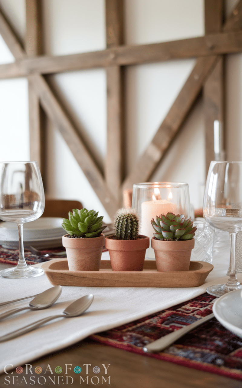 Tiny potted plants or succulents bring life to your table. Group a few together or scatter them along the table for a fresh, green vibe. Low-maintenance and affordable, they add texture and a natural feel without cluttering your dining area.