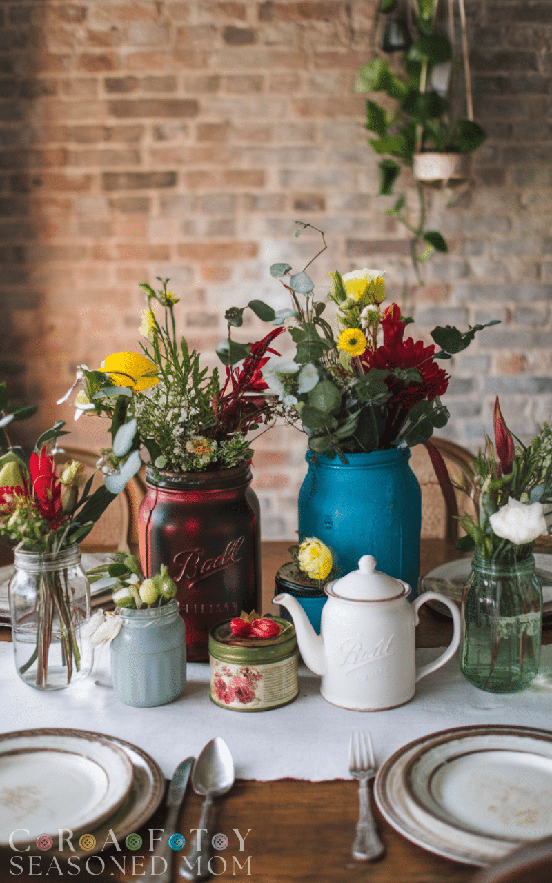 Use mason jars, teapots, or vintage tins as vases or holders. This creative, budget-friendly approach transforms everyday items into stylish decor, giving your dining table a unique, personalized look.