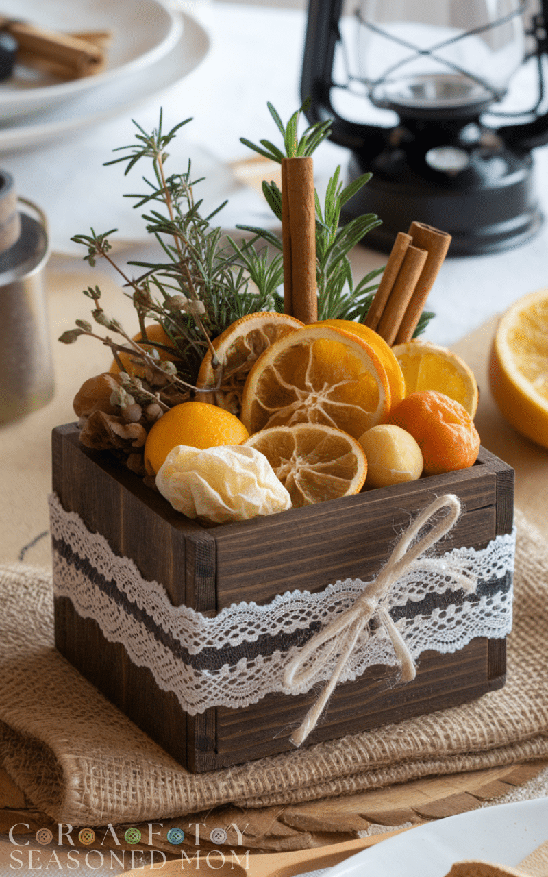 Add dried fruits, herbs, or cinnamon sticks as part of your centerpiece. These items are cheap, natural, and aromatic, giving your table decor a seasonal and sensory-friendly charm without costing much.