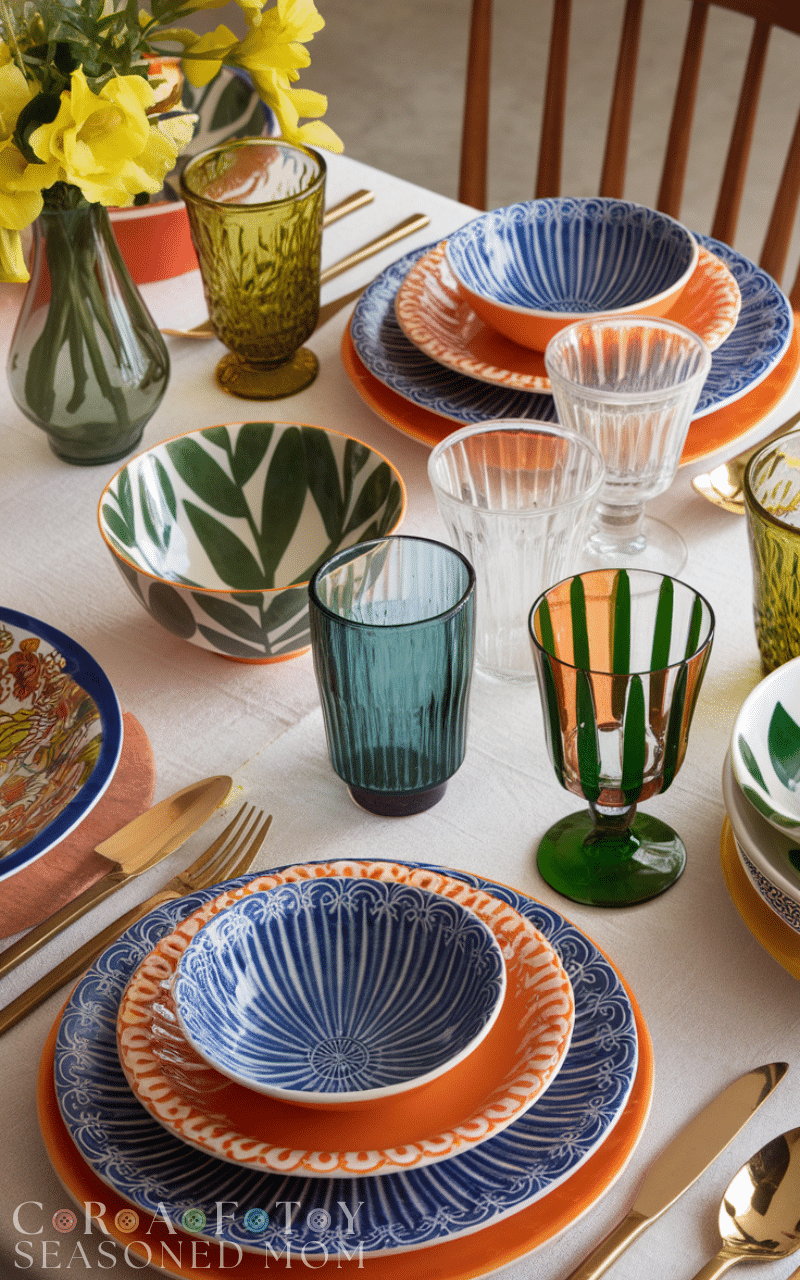 Combine plates, bowls, and glasses of different styles or colors for an eclectic look. Thrift stores often have affordable options. This budget-friendly approach adds personality and creativity to your table while keeping it functional.