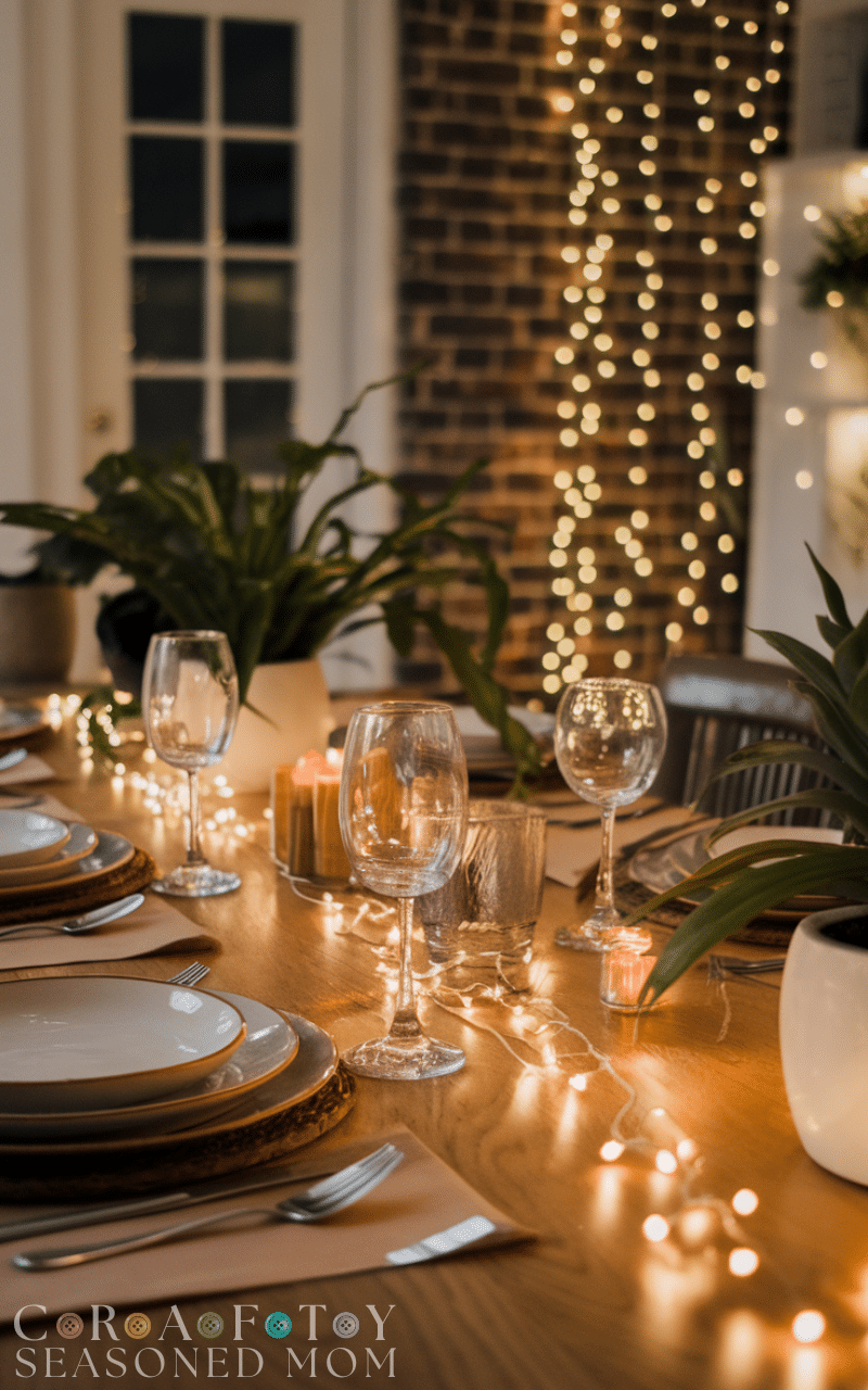 Use small LED lights, string lights, or tea lights to create a warm glow. Lighting instantly enhances your dining table’s ambiance and makes meals feel cozy and inviting. This affordable idea adds depth and a soft, elegant touch.