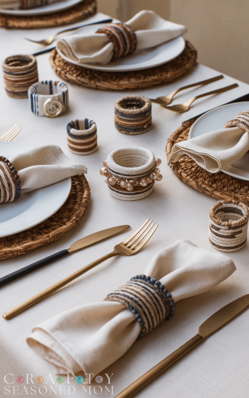 Make your own napkin rings using twine, beads, or recycled materials. They add a personal and stylish touch to your table while being extremely budget-friendly. This small detail makes a big impact in elevating your table decor.