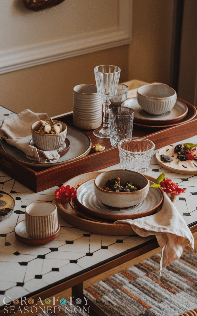 Mix different textures for a stylish effect. Combine linen napkins, wooden trays, ceramic bowls, and glassware for a layered look. This inexpensive technique adds depth and interest, making your table visually appealing and elegant without spending a lot.