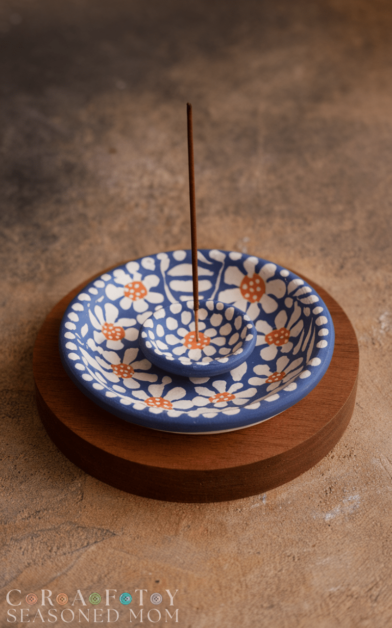 You can craft a beautiful incense holder from air dry clay by shaping a small dish with a hole for the incense stick and once it dries decorate it with paint or patterns and this easy air dry clay project is calming to make and adds a relaxing touch to your meditation or reading space.