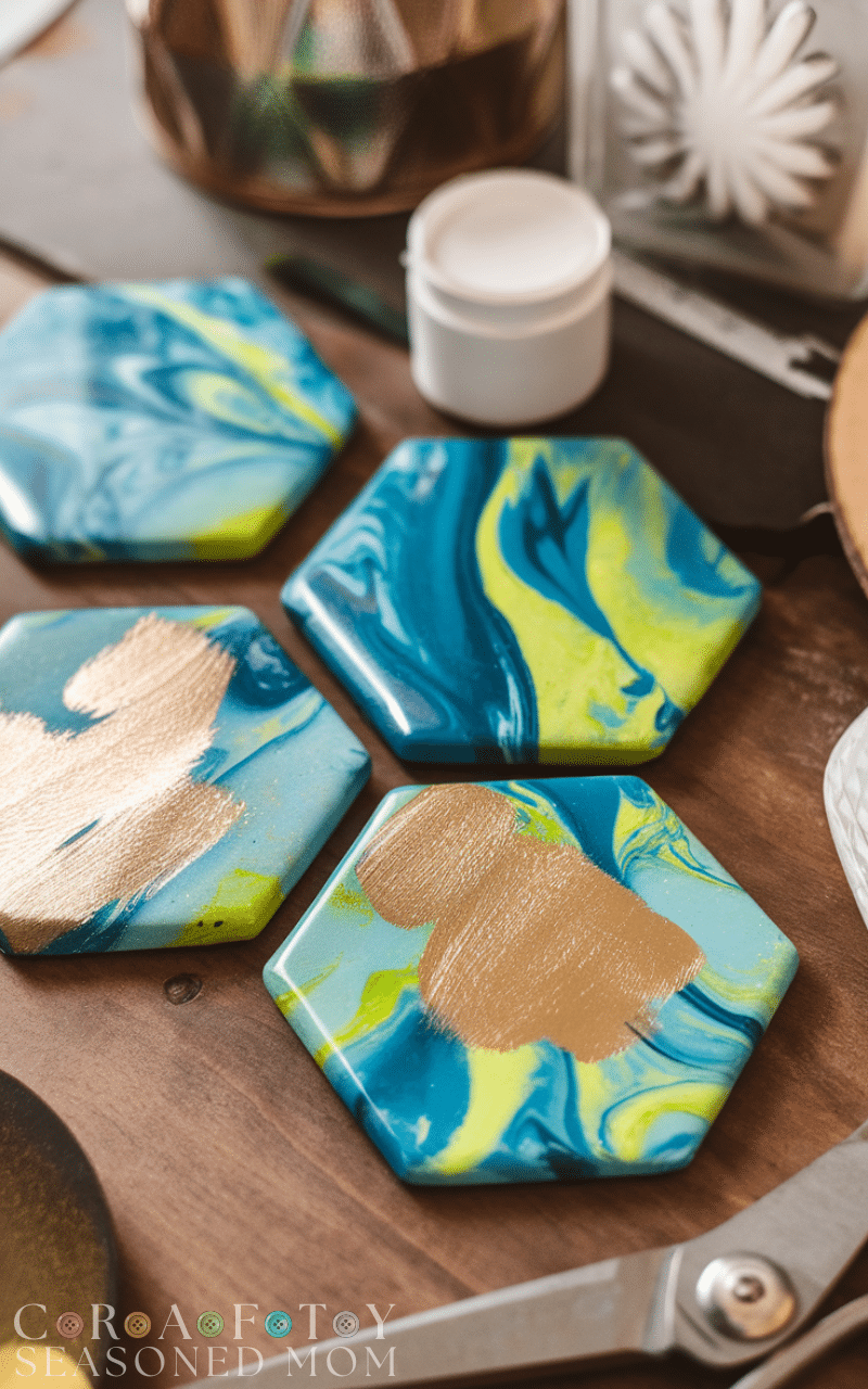 Air dry clay coasters are an amazing DIY to brighten your coffee table and all you need to do is roll out the clay and cut out round or hexagon shapes and after drying you can decorate them with marbling effects or metallic paint and seal them to make them water resistant and this easy air dry clay project combines function and creativity in one and gives you something beautiful and handmade to use every day.
