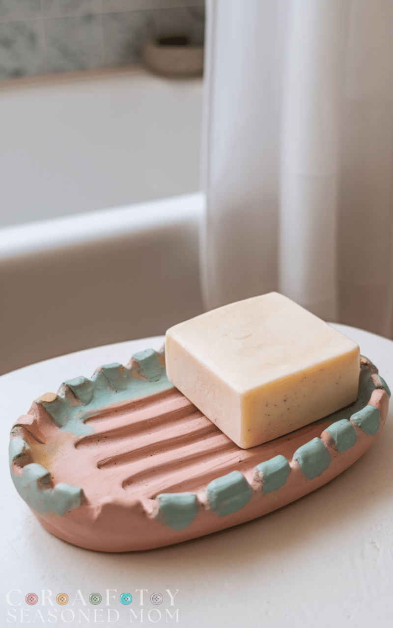 A handmade soap dish made of air dry clay is both functional and elegant and you can mold the clay into an oval or square shape add ridges to help the soap stay dry and once finished you can paint it in soft colors for a spa look and this easy air dry clay project makes your bathroom feel more personal and relaxing.