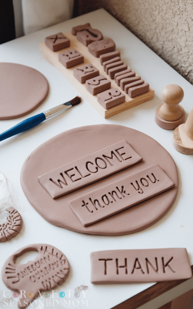 Creating personalized name tags with air dry clay is an enjoyable craft and you can roll out the clay cut rectangles or circles and use letter stamps to imprint names or words then paint them after they dry and this easy air dry clay project is wonderful for labeling gifts or decorating your workspace.