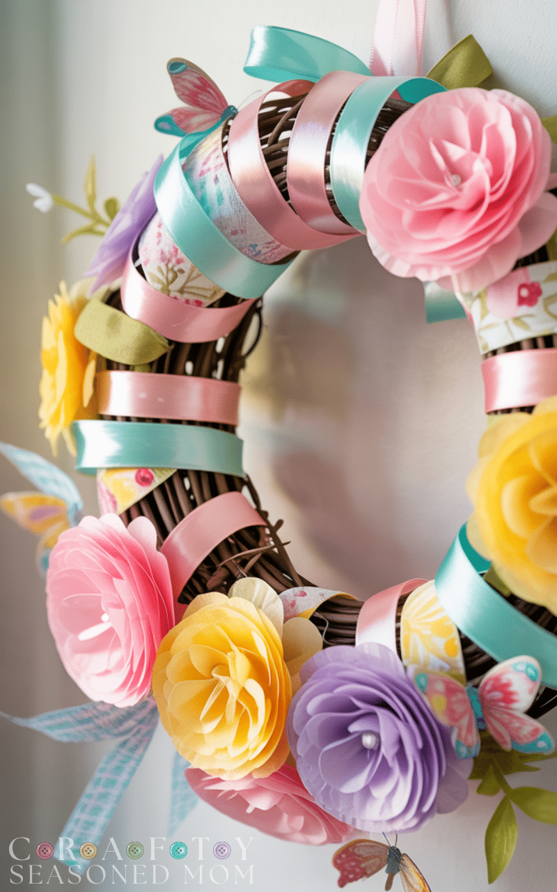 Finish off with a DIY spring wreath using paper flowers, ribbon, or fabric scraps. Kids can assemble and decorate the wreath however they like. These easy spring crafts for kids provides a sense of accomplishment as they see their creative vision come to life. It’s perfect for hanging on doors or walls, giving your home a festive and colorful spring touch.