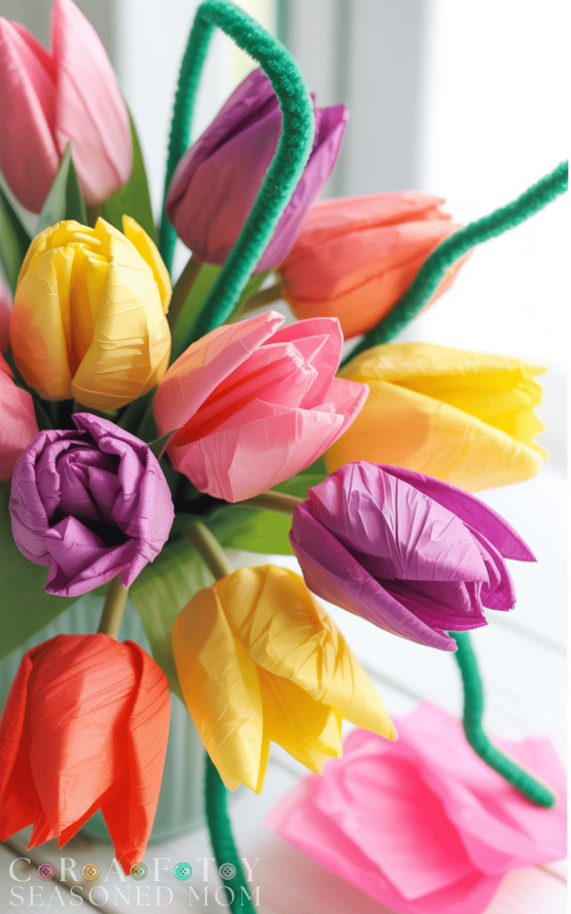 Tissue paper tulips are bright, vibrant, and super simple to make. Kids crumple tissue paper into small balls for petals and attach them to pipe cleaners as stems. This activity is one of the most cheerful easy spring crafts for kids and allows for endless color combinations. These tulips are perfect for making spring bouquets, decorating the house, or even gifting to friends and family as a cheerful, handmade surprise.