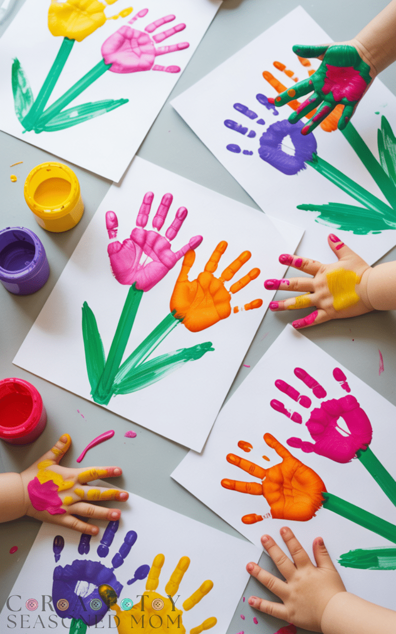 Handprint flowers are a timeless and fun craft for kids of all ages. Using colorful paint, kids trace and stamp their hands onto paper to form petals, then add stems and leaves. It’s an easy, tactile, and personal way to create art that can be displayed proudly. This project is a perfect example of easy spring crafts for kids because it’s simple, inexpensive, and doubles as a keepsake that parents will cherish for years.