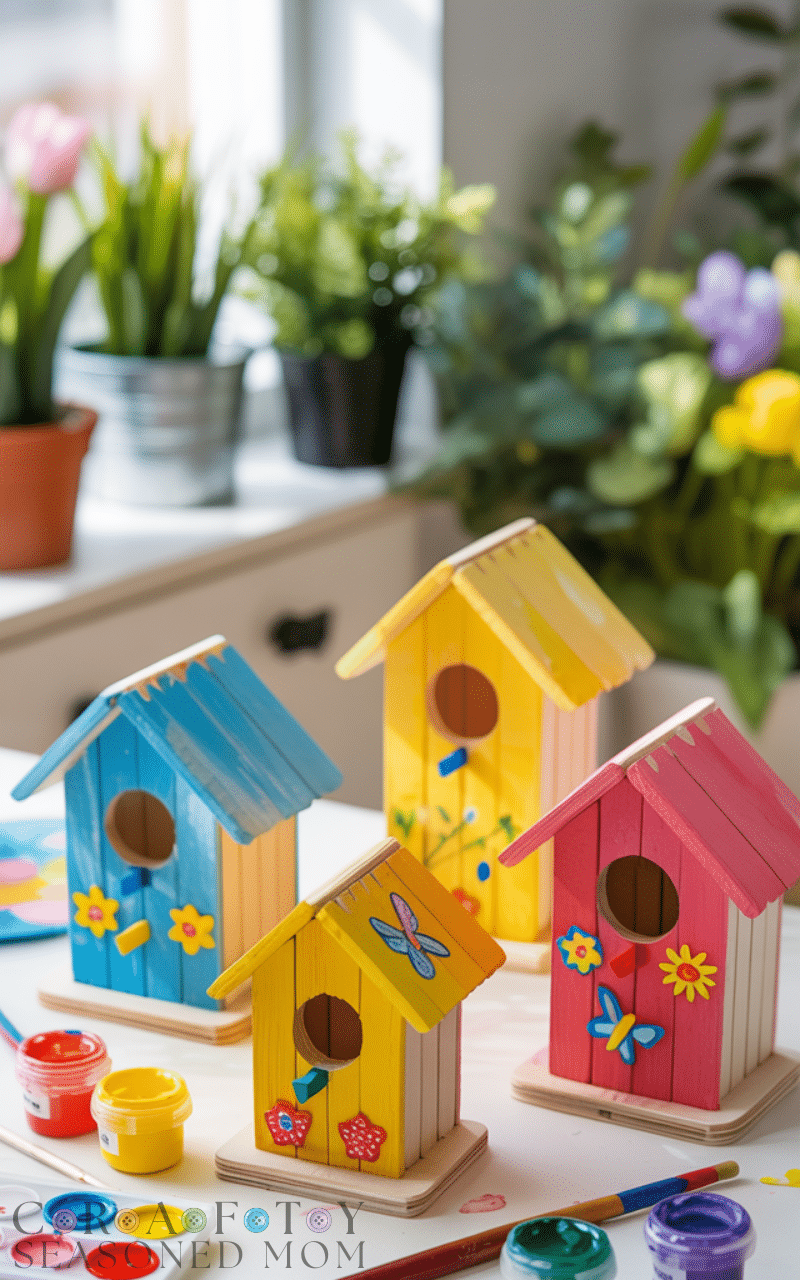 Build tiny birdhouses from popsicle sticks and decorate them with paint. This easy spring craft for kids introduces them to basic construction while allowing creativity to flow. Kids love personalizing their birdhouses with bright colors and stickers, creating a playful and functional decoration. Once finished, these birdhouses can be displayed indoors or in a safe outdoor space, making it a rewarding craft that celebrates spring and nature.