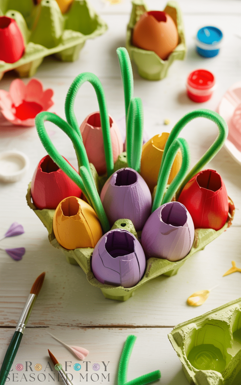 Transform egg cartons into colorful flowers with paint and pipe cleaners. Kids can cut, paint, and arrange them into bouquets or make a spring garden display. This simple activity allows them to experiment with shapes, colors, and textures while creating something beautiful. Egg carton flowers are one of the most budget-friendly easy spring crafts for kids, and they’re perfect for classroom or at-home activities that celebrate the season.
