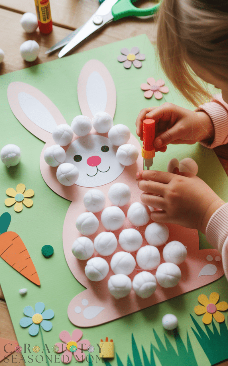 A cotton ball bunny is an adorable easy spring craft for kids that’s perfect for celebrating the season. Kids can glue white cotton balls onto a bunny-shaped cutout and add a paper face. It’s soft, fluffy, and so satisfying to assemble. You can even make a little garden scene with pastel-colored paper for an extra spring touch. This craft encourages kids to use their fine motor skills while enjoying a cute spring project they can proudly display.