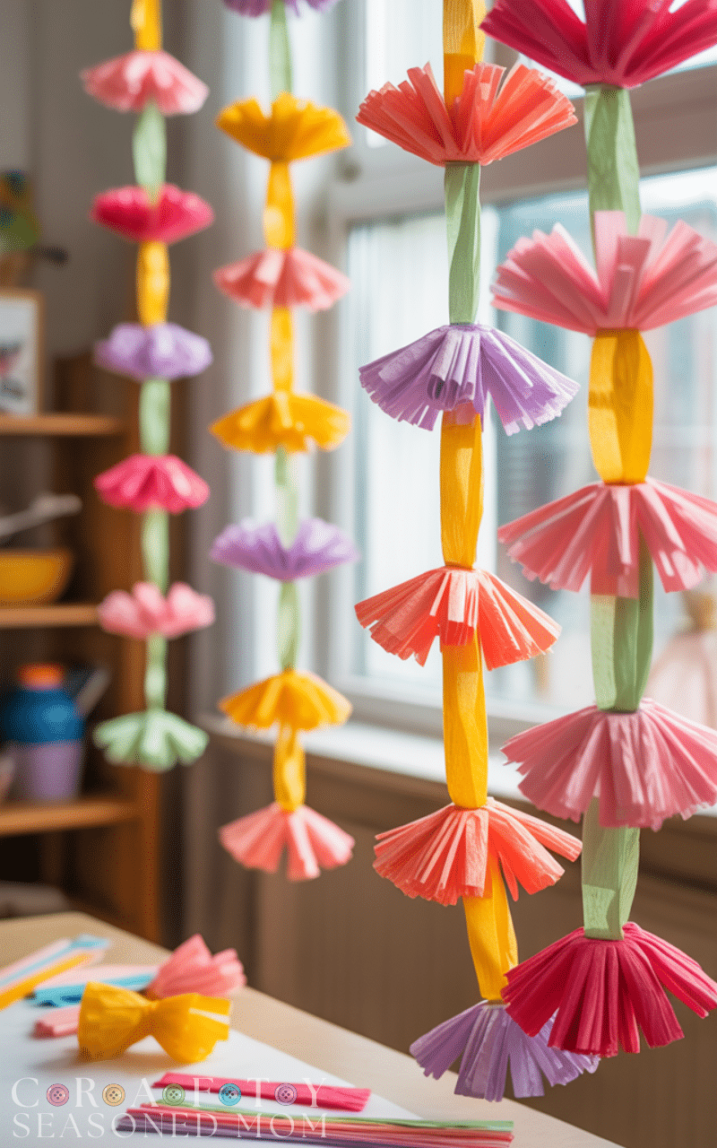Create long chains of paper flowers using strips of colored paper glued together. These easy spring crafts for kids are perfect for group activities, classrooms, or at-home crafting sessions. Kids will enjoy the repetition of folding and connecting the flowers, resulting in a bright and cheerful decoration that can hang anywhere in the house.