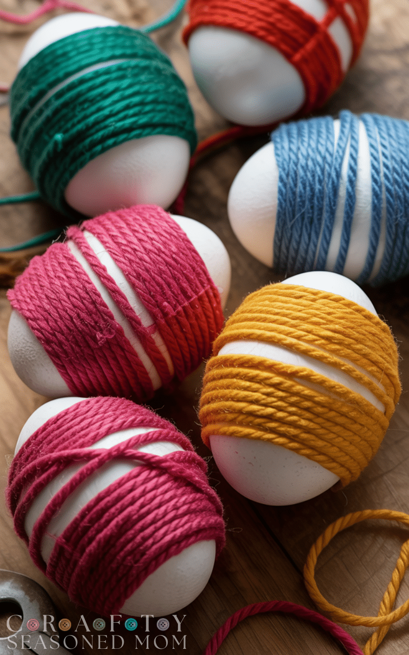 Wrap colorful yarn around plastic or paper eggs for a textured and vibrant decoration. Kids can experiment with patterns, colors, and designs, making each egg unique. Yarn-wrapped eggs are easy spring crafts for kids because they’re simple, mess-free, and allow endless customization. They make delightful decorations for spring displays.