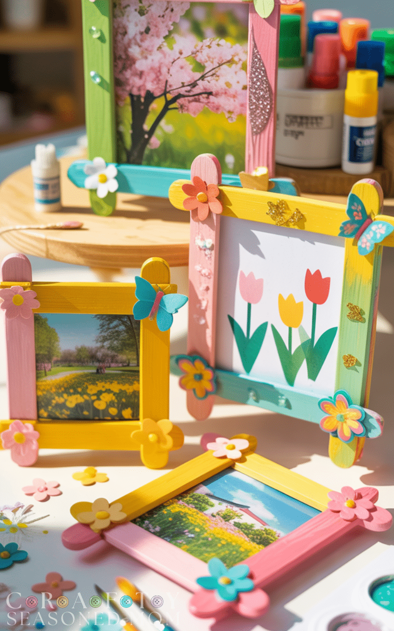 Decorate popsicle sticks to create photo frames that can display spring-themed pictures or artwork. Kids can paint, glue, and add stickers or small embellishments. These easy spring crafts for kids allow them to personalize a gift or keepsake while practicing fine motor skills and creativity. Once complete, these frames can showcase spring memories or artwork proudly around the home.