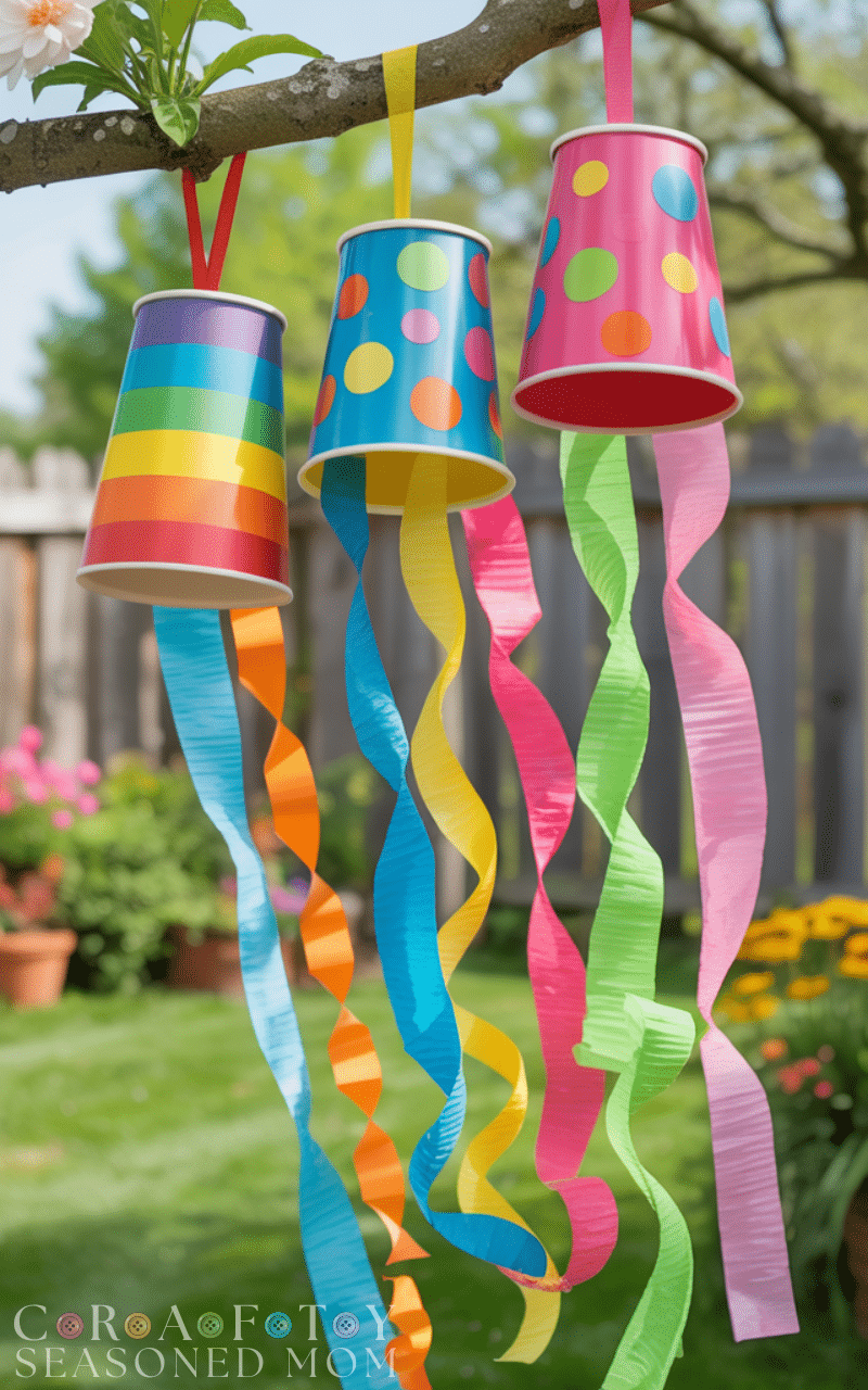 Make colorful windsocks using paper or plastic cups and streamers. Kids can decorate them with bright colors and hang them outside to spin in the breeze. This easy spring craft for kids is exciting because it combines art with movement, giving kids a tangible, dynamic result of their creativity. They’ll love seeing their creation flutter in the wind while learning about colors and patterns.