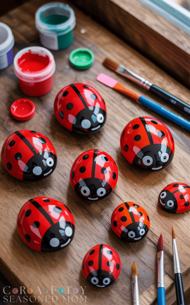 Collect small rocks and turn them into cute ladybugs using paint and markers. Kids can dot, color, and decorate them in red and black, creating cheerful spring critters. Rock ladybugs are one of the simplest easy spring crafts for kids, promoting creativity, fine motor skills, and outdoor exploration. These painted rocks can be used as garden decorations or little gifts, spreading spring cheer everywhere.