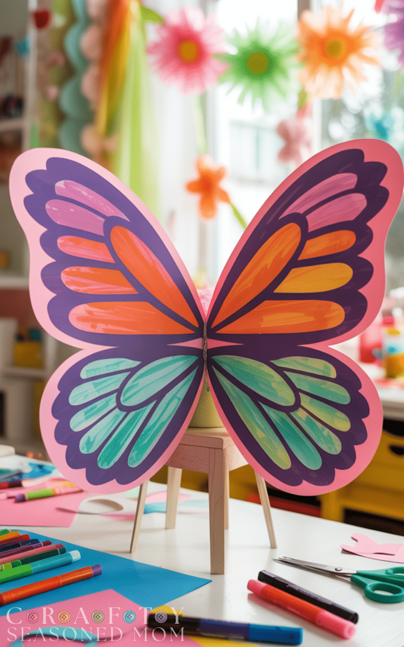 Kids can create their own colorful butterfly wings using paper, markers, and string. Once made, they can wear them and pretend to flutter around like real butterflies. This easy spring craft for kids encourages imaginative play while also being a visually striking project. It’s perfect for a spring-themed party or a playful afternoon at home, giving children both a craft and a costume to enjoy.