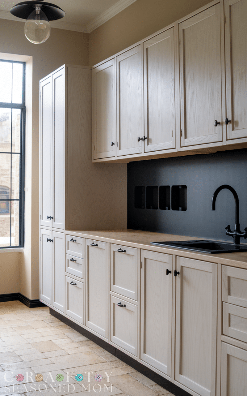 For a bold look, kitchens with white oak cabinets pair beautifully with black accents. Black countertops, lighting fixtures, or window frames create dramatic contrast while allowing the oak to soften the overall design. The result feels modern and stylish.