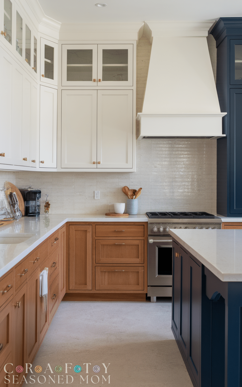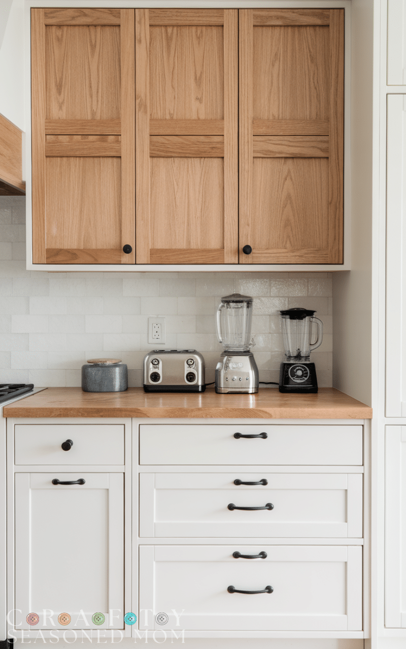 Two-tone kitchens with white oak cabinets feel fresh and modern. Use white oak for base cabinets and paint upper cabinets in soft white, sage, or navy. This contrast adds dimension while maintaining warmth and brightness. It’s perfect for adding personality without overwhelming the space.