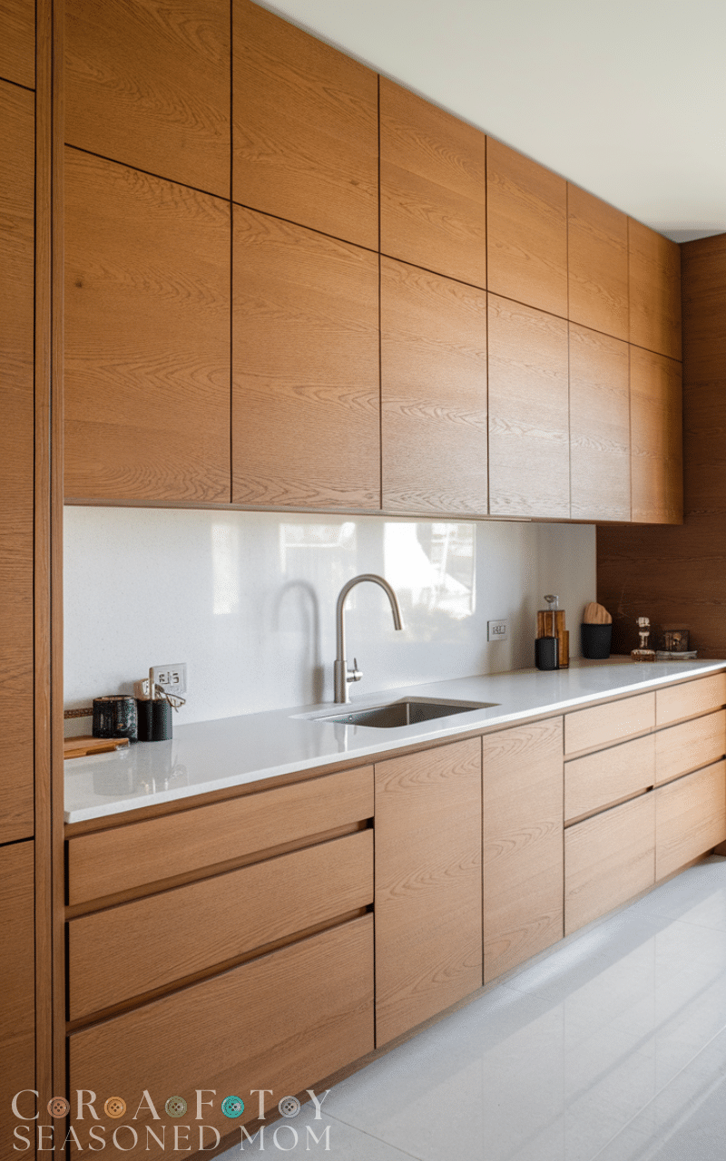 Handleless kitchens with white oak cabinets feel ultra-modern and streamlined. Push-to-open systems keep the design clean while allowing the wood texture to be the main focal point.