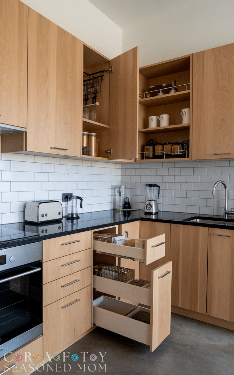 Kitchens with white oak cabinets can be both beautiful and practical. Integrated pull-out drawers, pantry organizers, and hidden compartments keep the kitchen clean and clutter-free while maintaining sleek aesthetics.
