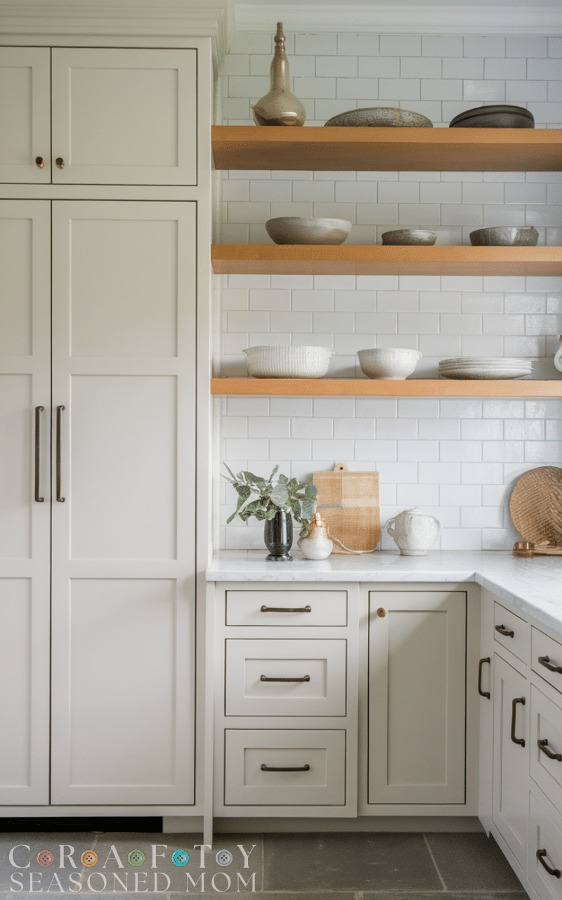 Combining closed cabinets with open shelving adds balance to kitchens with white oak cabinets. Floating oak shelves create display space for dishes or décor while keeping the room light and functional.