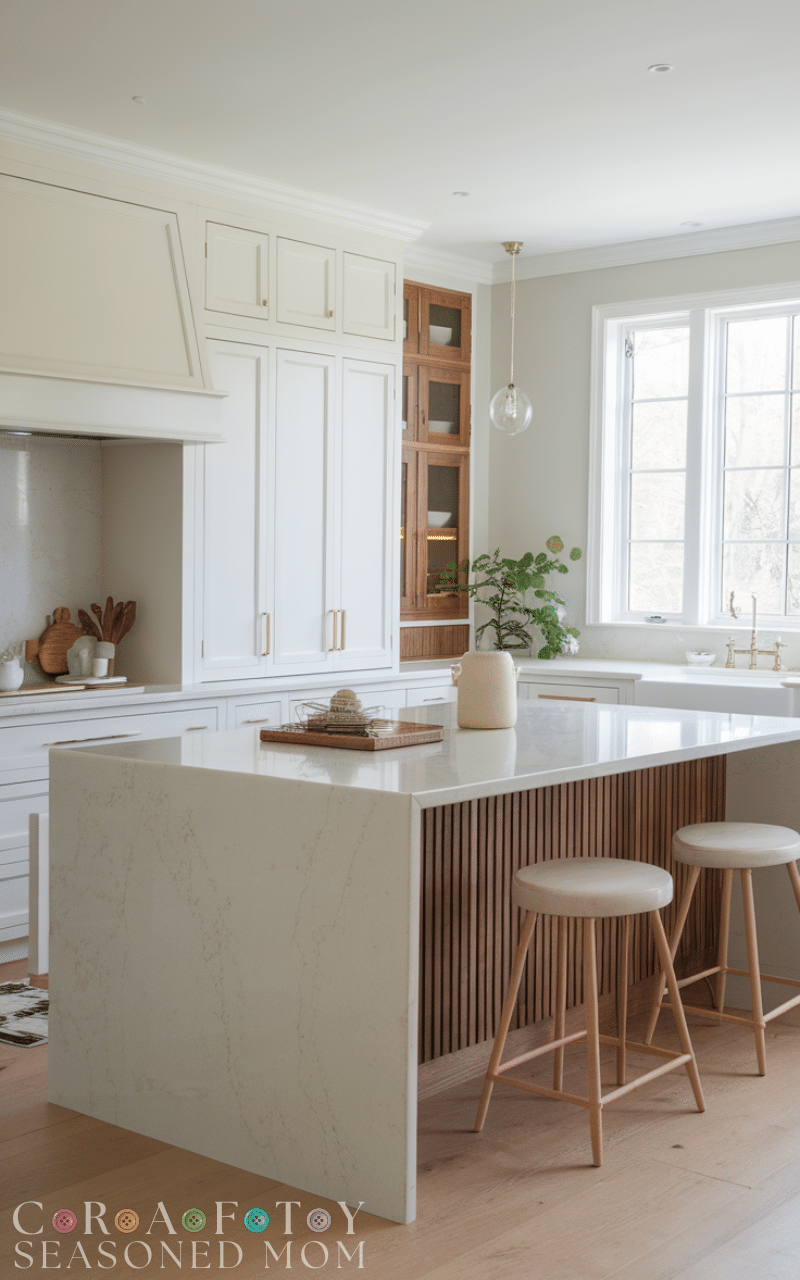 A waterfall island elevates kitchens with white oak cabinets instantly. Pair oak cabinetry with a waterfall quartz or stone countertop for a sleek, modern centerpiece. This design feels high-end while maintaining warmth through the wood texture.