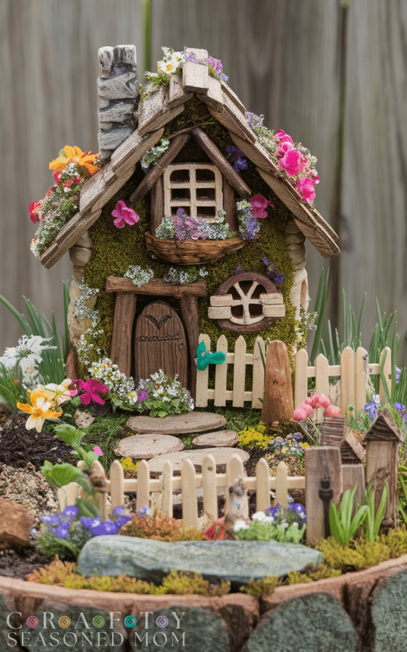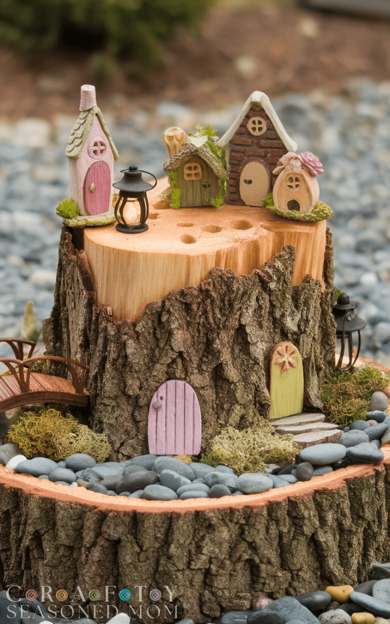 Transform an old tree stump into a whimsical village because this is one of the most creative mini fairy garden ideas and it gives life to something that was once forgotten and you can carve out small spots for fairy houses or glue tiny wooden doors around the stump and surround it with pebbles and soft moss to make it look alive and magical and you can even add a small bridge or lanterns to make the space feel like a real fairy kingdom.