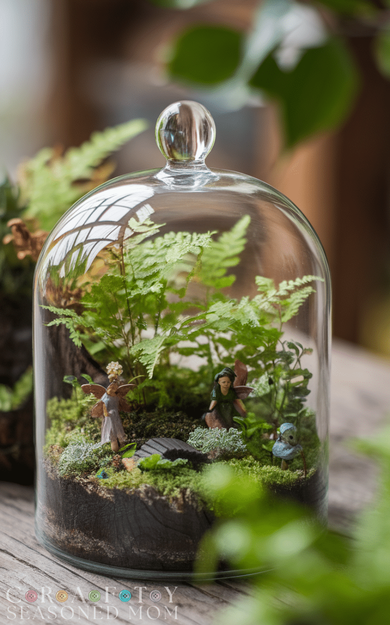 A glass terrarium makes a perfect home for fairies because this is one of the most versatile mini fairy garden ideas and you can use small ferns and moss to create a forest atmosphere and place a few fairy figurines and maybe a miniature wooden bridge and the glass dome keeps moisture in so your plants stay fresh and green and it becomes a little world full of calm and imagination.