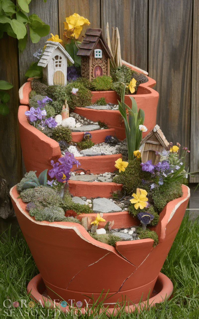 Instead of throwing away a cracked flower pot you can turn it into one of the most creative mini fairy garden ideas and use the broken edges to create steps and layers for your fairy village and decorate each level with moss and flowers and little houses and it gives a lovely cascading effect that looks like a fairy hillside and it is a great way to recycle and add magic to your garden.