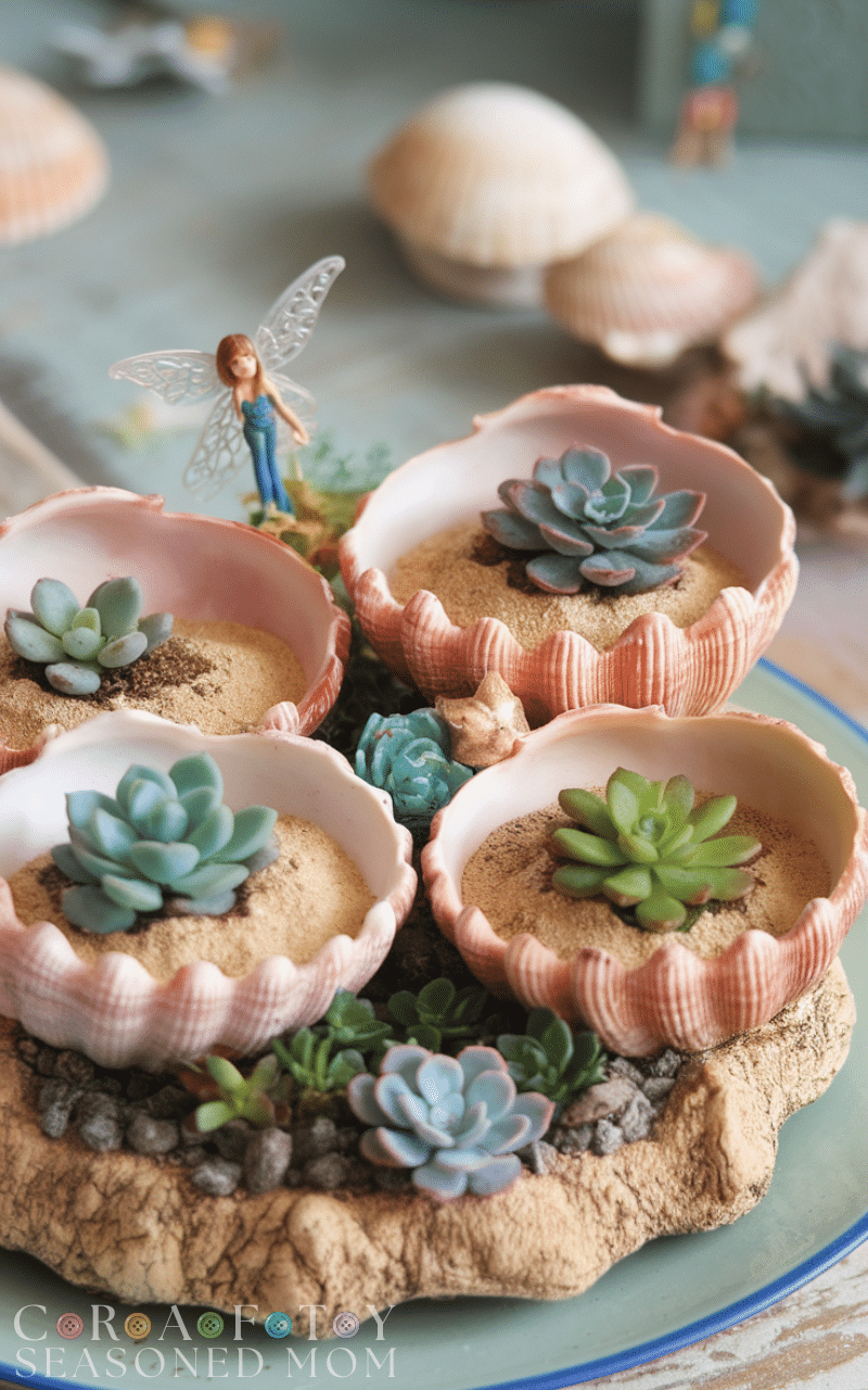 If you love the ocean then this is one of the most perfect mini fairy garden ideas for you and collect large seashells and fill them with sand and tiny succulents and fairy decorations to create a coastal fairy scene and you can place it in your bathroom or balcony for a relaxing beach vibe and it is simple and elegant and reminds you of summer all year long.