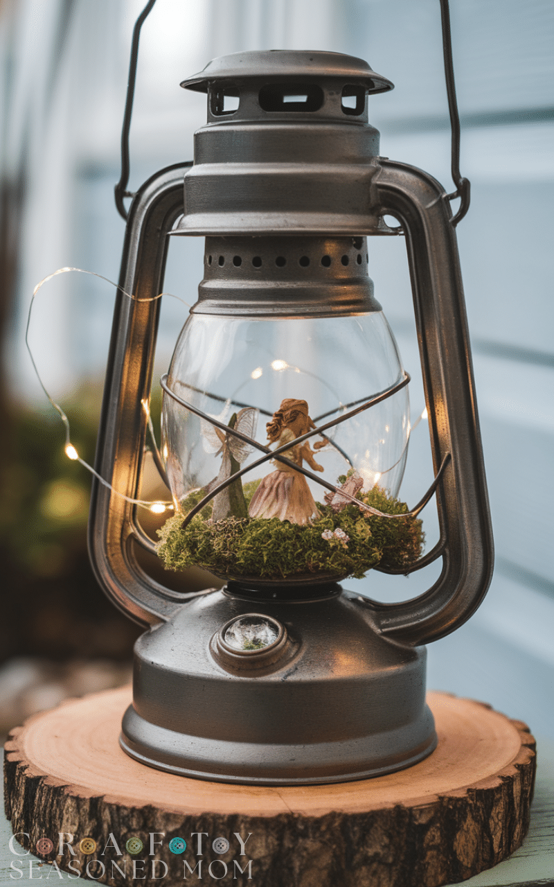 Find an old lantern and turn it into a cozy fairy home because this is one of the most beautiful mini fairy garden ideas that blend light and magic together and remove the glass panels if needed and fill the inside with moss and fairy figures and small flowers and you can add battery fairy lights to make it shine at night and this tiny garden looks wonderful both indoors and outdoors.