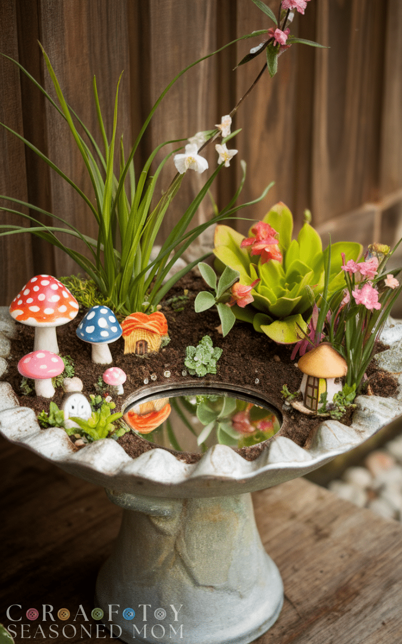 If you have an old birdbath that is no longer used then turn it into one of the most creative mini fairy garden ideas and fill it with soil and bright miniature plants and you can decorate it with tiny mushrooms and fairy houses and a little pond made from a small mirror to reflect light and beauty and this garden will become the centerpiece of your outdoor space and attract attention with its enchanting charm.