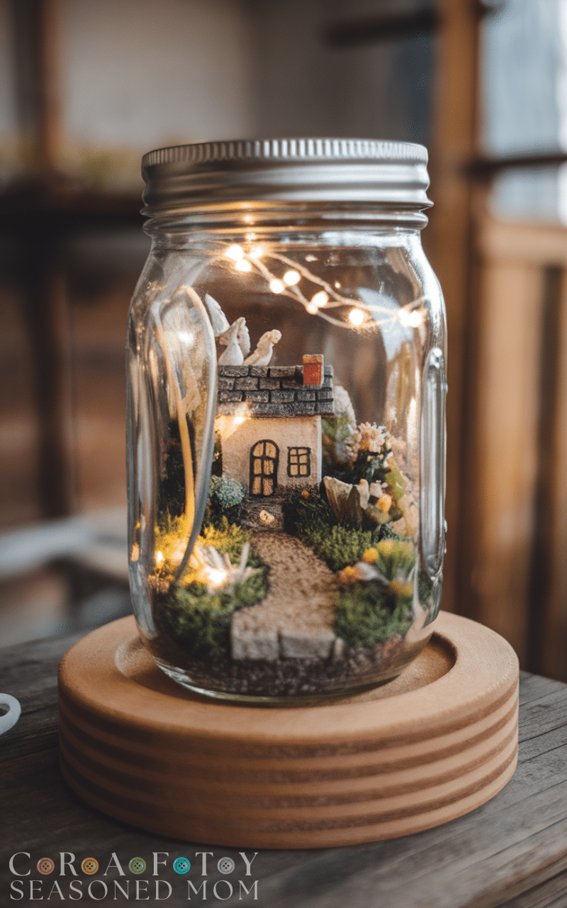 A mason jar can turn into a sparkling home for your fairies and this is one of the most charming mini fairy garden ideas for small spaces and you can add a bit of soil and mini plants and then place tiny fairy lights to make it glow beautifully at night and the transparent glass gives a view of the little world inside which makes it an ideal decoration for bedrooms and living rooms and you can easily personalize it with your favorite tiny figurines.