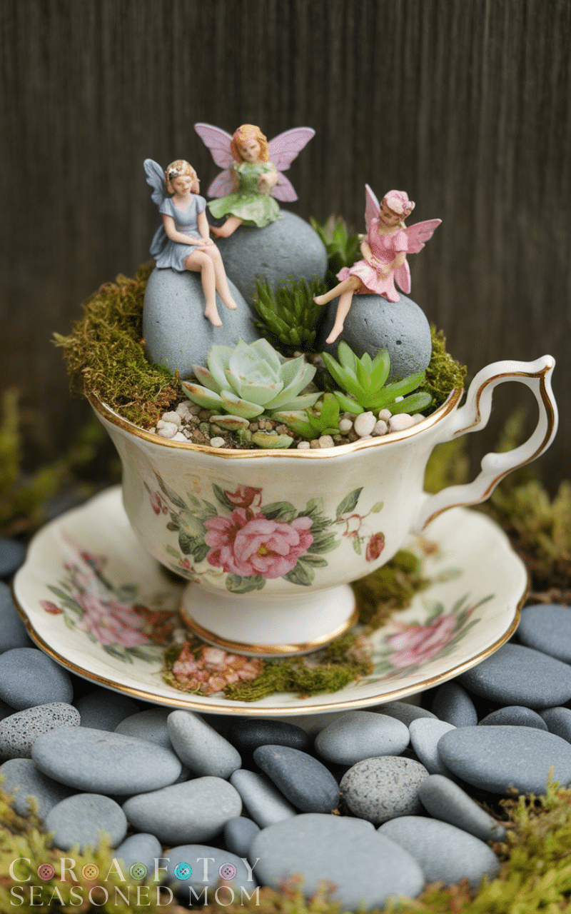 If you want to try something truly magical then one of the best mini fairy garden ideas is to use an old teacup as a base for your creation and you can fill it with a little soil and some moss and tiny succulents and small decorative stones to build a cozy home for your fairies and this simple design can sit perfectly on a window sill or office desk and it always brings joy whenever you see it and the best part is that you can easily move it anywhere and refresh its look with new fairy figurines whenever you like.