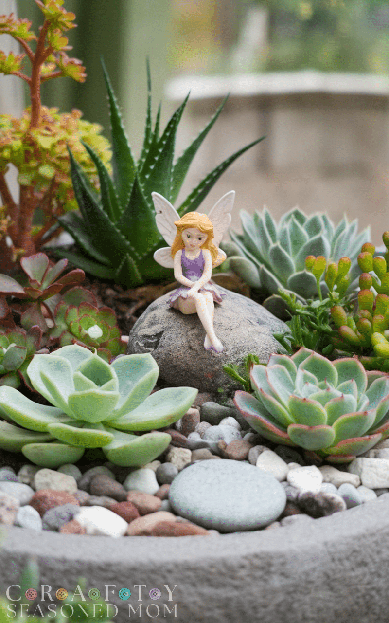 Succulents are low maintenance and make one of the most practical mini fairy garden ideas and you can use a shallow pot and plant small succulents of different shapes and colors and add fairy figures and a few decorative stones to bring it to life and this type of garden is perfect for busy people who still want a bit of fairy charm around their home.