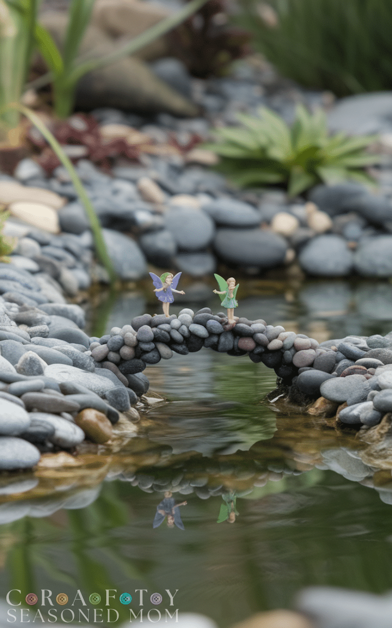 Add a tiny bridge over a small pond or river made from pebbles and you get one of the most peaceful mini fairy garden ideas and it brings balance and beauty to your fairy world and you can use a small mirror or blue stones to create the water effect and the bridge adds depth and storytelling to your design as if fairies are crossing it to reach their magical home.