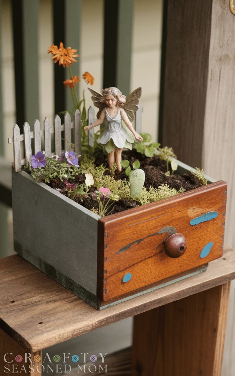 Old drawers can become charming homes for your fairies and that makes them one of the most sustainable mini fairy garden ideas and fill the drawer with soil and moss and decorate with small fences and fairies and flowers and place it on your porch or patio for a rustic look that captures everyone’s attention and gives new life to something that would otherwise be thrown away.
