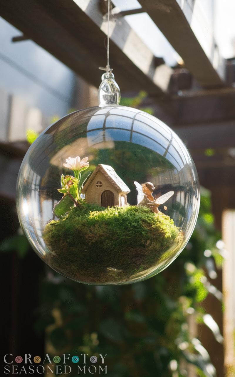 If you want something elegant then one of the most stylish mini fairy garden ideas is to use a glass globe that you can hang and fill it with moss and a tiny fairy house and maybe a small figure sitting by a flower and this floating world adds a magical touch to your space and looks beautiful in windows or patios where sunlight can pass through it.