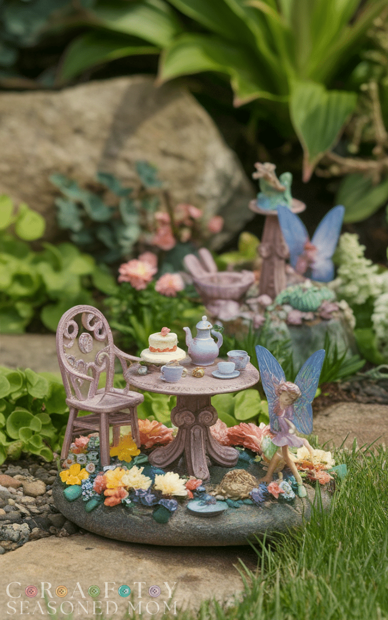 Host a magical scene by creating a fairy tea party and this is one of the cutest mini fairy garden ideas where you can arrange small tables and chairs and use tiny cups and plates and surround them with miniature flowers and fairy guests and it tells a story that makes your garden feel alive and full of joy and you can keep adding new accessories to make it even more delightful.