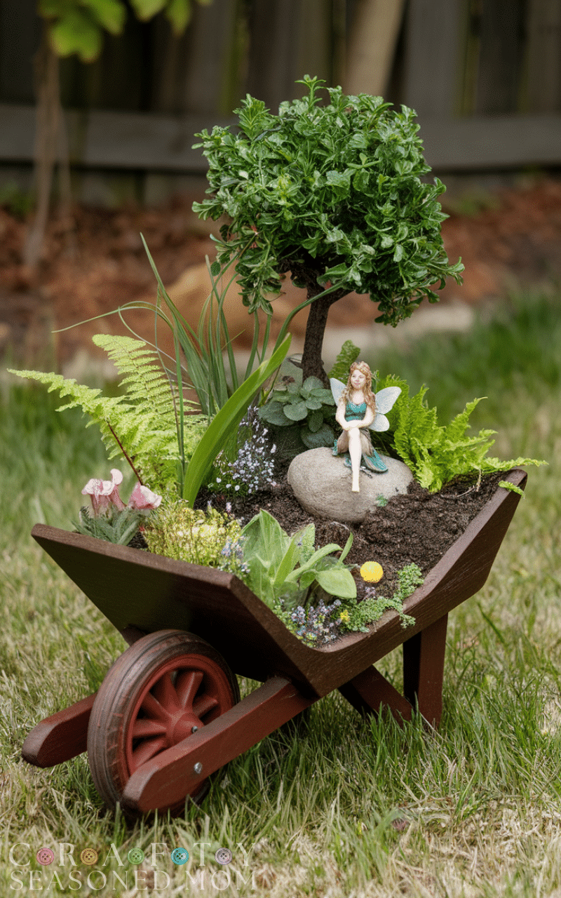 A small wooden or metal wheelbarrow can be turned into one of the most creative mini fairy garden ideas and you can fill it with soil and add plants and fairy décor and the best thing is that you can move it around your garden and change its position depending on the season and this mobile fairy world will always look charming wherever you place it