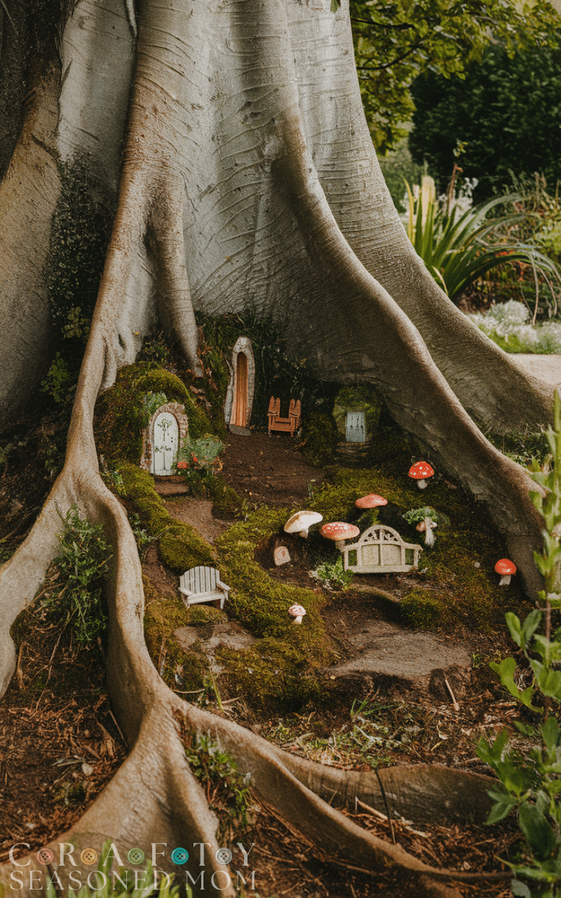 When you see a large tree with visible roots you can use it as a natural base for one of the most authentic mini fairy garden ideas and add small doors between the roots and place little fairy items like mushrooms or benches and surround it with moss to make it blend with nature and this makes it look like fairies truly live under your tree and it adds a mysterious touch to your garden.
