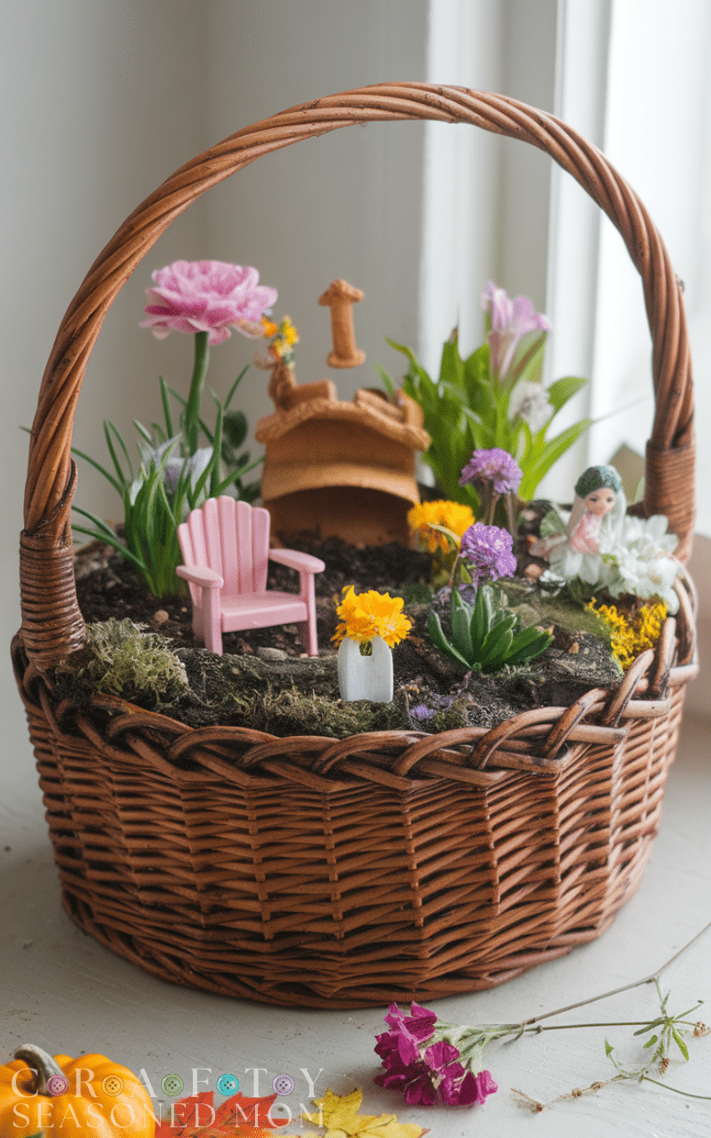 Take an old wicker basket and transform it into one of the sweetest mini fairy garden ideas and fill it with soil and add soft moss and colorful flowers and tiny fairy furniture and this mobile fairy garden is easy to carry and makes a lovely gift for children or nature lovers and you can refresh it anytime by adding seasonal touches like tiny pumpkins in autumn or small flowers in spring.