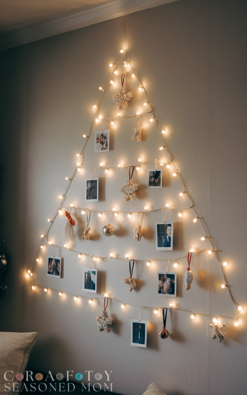 For small spaces or minimalist vibes a wall string light tree is one of the most creative Christmas trees you can make at home. You only need a few strands of lights and some tape or nails to shape a glowing triangle on the wall. You can hang ornaments or family photos along the lights so it feels personal and festive. This creative Christmas tree saves space while still spreading magical holiday energy throughout your home and it is ideal for apartments or dorms that need a touch of sparkle without taking up floor space.